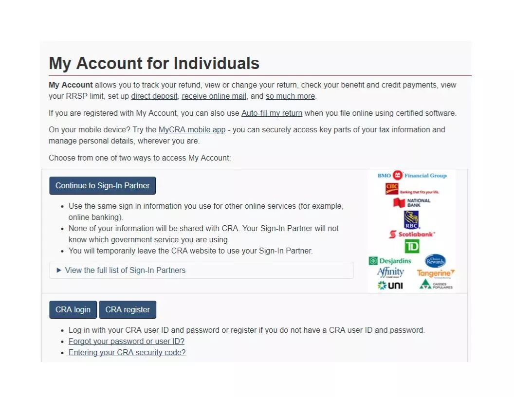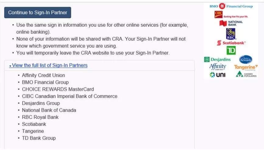 其实除了CRA Login,大家还可以选择的一个办法就是通过Sign-in Partner来登录CRA,也就是你的网银账户。用这个方式登录的好处就是不容易忘记User ID和密码。