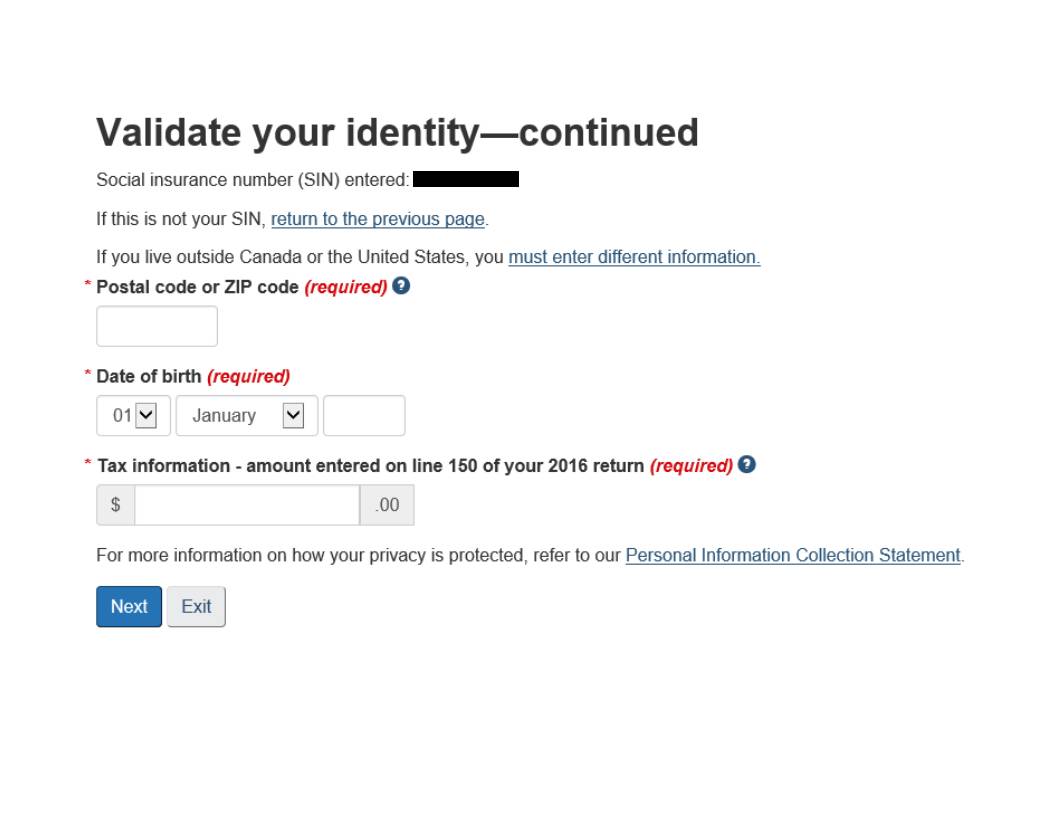 接着便进入注册程序,和CRA Login是相同的,SIN、Postal code、date of birth、报税信息。完成之后,一样需要一个security code。